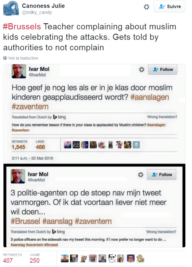 ...le carnage de Bruxelles, l'un des professeur l'ayant twitté reçoit une visite des policiers !